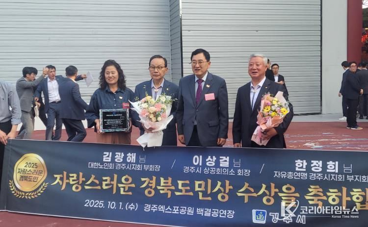 코리아타임뉴스 윤경수 기자 | 경주시는 1일 열린 ‘2025 자랑스러운 경상북도민상’ 시상식에서 경주시민 3명이 수상자로 선정되는 영예를 안았다고 밝혔다.