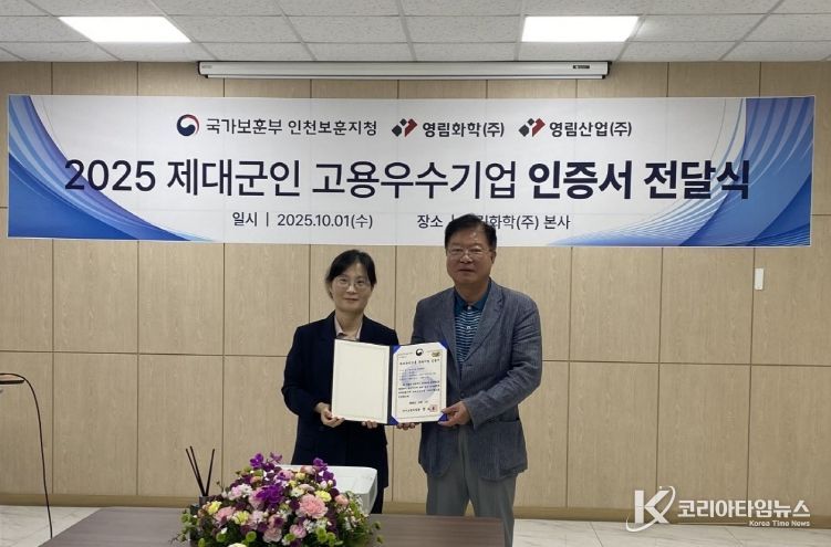 코리아타임뉴스 윤경수 기자 | 국가보훈부 인천보훈지청(지청장 직무대리 최은진) 제대군인지원센터는 2025년 10월 1일에 제대군인 주간을 맞아 영림그룹의 계열사인 영림화학(주)과 영림산업(주)을 방문하여 제대군인 고용 우수기업인증에 대한 현판식을 개최했다.
