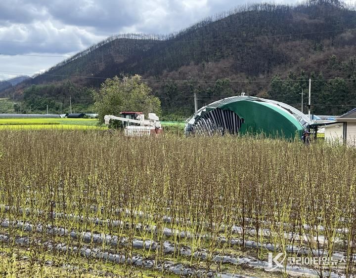 콩 콤바인 구조를 변형한 전용 콤바인으로 수확하면 베기와 탈곡(낱알 떨기)을 동시에 수행할 수 있어 작업시간이 기존 방식 대비 약 99% 절감된다.