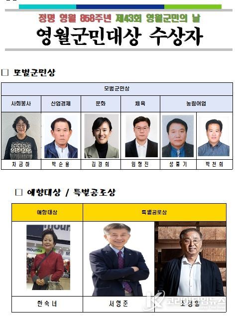 코리아타임뉴스 윤경수 기자 | 영월군은 정명 영월 858년 제43회 영월군민의 날을 맞이하여 다가오는 10월 31일(금), 17:00 스포츠파크 실내체육관에서 영월군민의 날 기념행사와 함께 군민대상 시상식을 개최한다.
