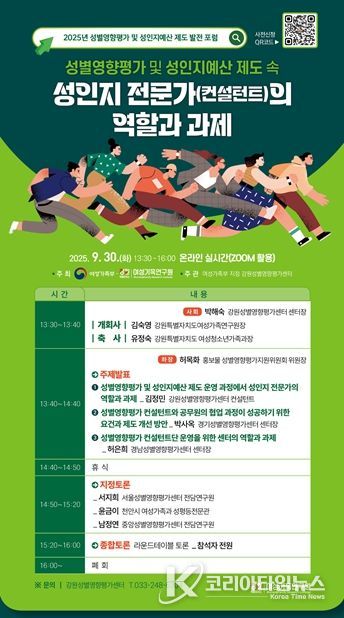 코리아타임뉴스 이아름 기자 | 강원특별자치도여성가족연구원에서는 9월 30일 오후 1시 30분, 온라인 실시간(ZOOM활용)으로 ‘2025년 성별영향평가 및 성인지예산 제도 발전 포럼’을 개최했다.