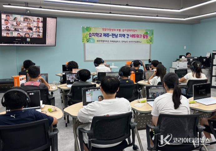 코리아타임뉴스 사회팀 | 제주도교육청 하례초등학교는 9월 30일 전남 순천인안초등학교와 함께 비대면 화상회의 플랫폼(ZOOM)을 활용해 생태관광을 주제로 공동수업을 진행했다.