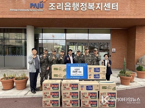 코리아타임뉴스 윤광희 기자 | 파주시 조리읍은 지난 29일, 제2기갑여단 본부근무대가 추석을 맞아 지역 내 어려운 이웃을 돕기 위해 컵라면 등 즉석식품 16상자를 기탁했다고 밝혔다.