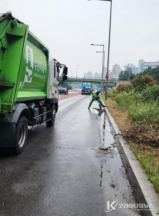 코리아타임뉴스 사회팀 | 수원특례시 영통구는 '대한민국 새단장' 캠페인의 일환으로 민족 최대의 명절 추석을 맞아 고향을 찾는 귀성객들에게 쾌적하고 안전한 도로 환경을 제공하고자 영동고속도로 동수원나들목 진출입로 집중 환경정비를 실시했다.