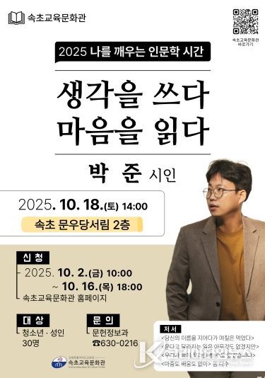 강연 참여 신청은 10월 2일 오전 10시부터 10월 16일 오후 6시까지 속초교육문화관 누리집을 통해 가능하다.