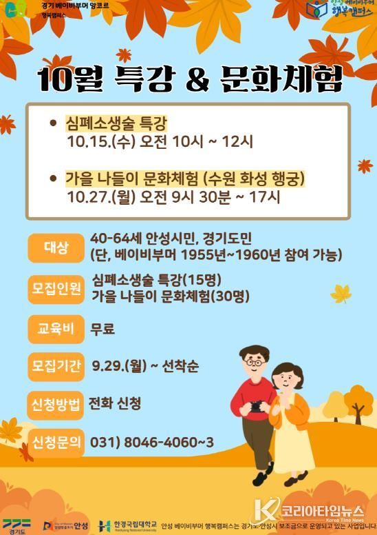 코리아타임뉴스 경기취재본부 | 안성 베이비부머 행복캠퍼스(한경국립대학교 평생교육원)는 오는 10월 15일부터 27일까지 중장년 안성시민(경기도민)을 대상으로 ‘10월 특강(심폐소생술) 및 문화체험(수원화성행궁)’ 프로그램을 운영한다고 밝혔다.