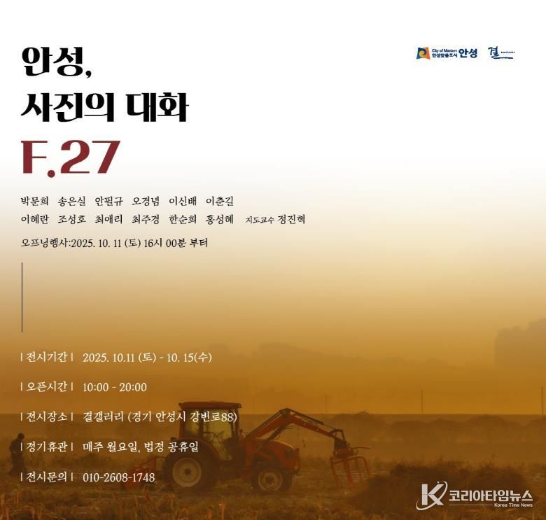 코리아타임뉴스 경기취재본부 | 안성시 사진동아리 F.27 photo가 오는 10월 11일부터 15일까지 안성천 작은미술관 결갤러리에서 전시회 ‘안성, 사진의 대화 F.27’을 개최한다. 이번 전시는 동아리 회원 18명이 참여해 안성의 자연환경과 사람들의 이야기를 기록한 작품을 선보인다.