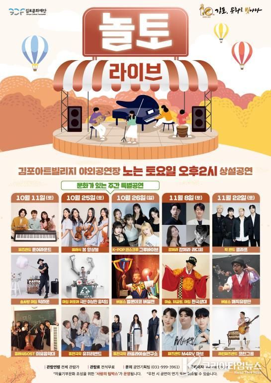 코리아타임뉴스 문화팀 | (재)김포문화재단은 10월 11일부터 11월 22일까지 매월 둘째, 넷째 주 토요일마다 김포아트빌리지 야외공연장에서 하반기 토요상설공연 '놀토 라이브'를 개최한다고 밝혔다.