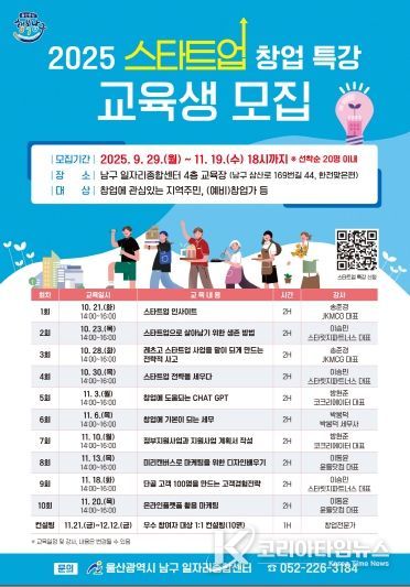 코리아타임뉴스 울산취재본부 | 울산 남구 일자리종합센터는 창업 역량 강화와 성공적인 창업 준비 기반을 마련하는 데 실질적인 도움을 주고자 ‘2025년 스타트업 창업 특강’교육생을 모집한다고 밝혔다.