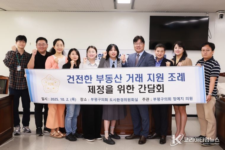 코리아타임뉴스 오영주 기자 | 인천 부평구의회 정예지 의원(더불어민주당 비례)은 지난 10월 2일 부평구의회 도시환경위원회실에서 '인천광역시부평구 건전한 부동산 거래 지원 조례'제정을 위한 간담회를 개최했다.