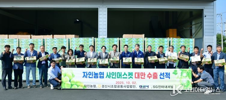 코리아타임뉴스 오영주 기자 | 경산시는 2일 자인농협 농산물유통센터에서 조현일 경산시장, 조지연 국회의원, 손병한 자인농협장, 포도 공선회원을 비롯한 관계자 30여 명이 참석한 가운데 대만 수출 선적식을 개최했다.