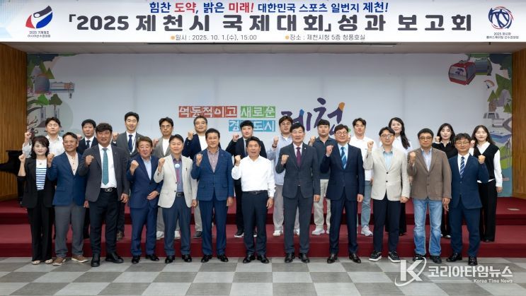 코리아타임뉴스 충북취재본부 | 제천시는 지난 1일 제천시청 5층 청풍호실에서 '2025년 제천시 국제대회'성과보고회를 개최했다. 보고회에는 김창규 제천시장, 박영기 제천시의회 의장, 김경석 대한롤러스포츠연맹 회장(이상 공동조직위원장), 장재돈 대한체조협회 고문과 안성국 제천시체육회장(집행위원장), 오재성 제천시체조협회장, 최호열 제천시롤러스포츠연맹회장(이상 공동 사무총장) 및 유관기관, 단체장 3명과 종목단체 임원 및 회원 50여 명이 참석했다.