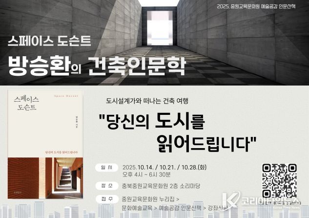코리아타임뉴스 사회팀 | 충청북도교육청 직속기관 중원교육문화원(원장 배상근)은 교육공동체 구성원들의 인문적 소양과 예술적 감수성을 높이기 위해 운영중인 문화교육 프로그램 '예술공감 인문산책'의 10월 강연 수강생을 선착순 모집한다고 전했다.