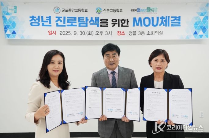 코리아타임뉴스 사회팀 | 군포시 청년공간플라잉(센터장 조남)은 지난 9월 30일 군포중앙고(교장 이은경), 산본고(교장 김은정)와 함께 2025 창업스쿨 사업 관련 업무협약을 맺었다.