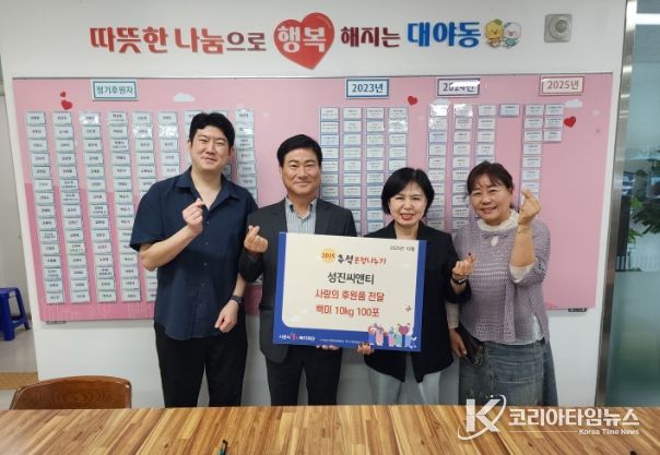 한성운 ㈜성진씨앤티 대표는 “대야동의 한 기업으로서 지역사회에 도움이 되고 싶어 기부를 결심했다”라며 “이번에 전달된 쌀이 추석을 앞두고 어려운 이웃들에게 작은 힘이 되길 바란다”라고 말했다.