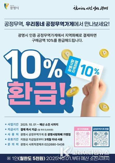 코리아타임뉴스 경기취재본부 | 광명시가 공정무역가게에서 광명사랑화폐(지역화폐)로 결제하면 결제금액의 10%를 돌려주는 ‘공정무역 실천 캐시백’ 행사를 진행한다고 9일 밝혔다.