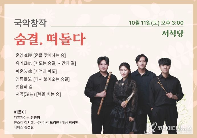 사람은 태어나고, 관계를 맺으며 살아가고, 언젠가 떠난다. 그러나 떠난다고 해서 모든 것이 사라지는 것은 아니다. 우리가 남긴 기억과 흔적은 주변 사람들의 마음속에서 순환하며, 삶과 죽음의 경계를 허문다. 퓨전국악 단체 떠돌이의 '숨결, 떠돌다'는 만남과 이별, 떠돎과 순환이라는 삶의 본질을 음악으로 풀어낸 무대다. 한국 전통 음악의 뿌리를 기반으로 하면서도 현대적 감각을 더한 이 공연은, 익숙하면서도 새로운 음악적 경험을 통해 생과 사의 의미를 되새기는 시간을 선사한다.
