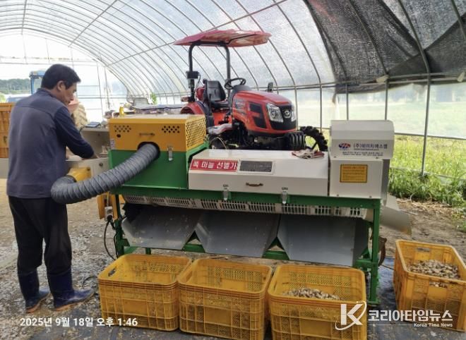 코리아타임뉴스 김택호 기자 | 당진시농업기술센터는 대호지면 일대에서 ‘양념채소 신품종 확산 스마트기계화 시범사업’을 본격 추진하며, 마늘 재배의 전 과정에 걸쳐 기계화를 지원하고 있다고 10일 밝혔다.