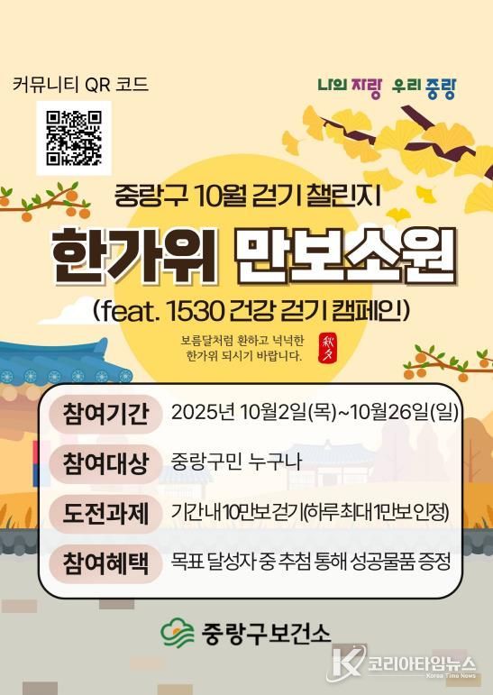 코리아타임뉴스 오영주 기자 | 중랑구는 모바일 걷기 앱을 활용한 '온라인 걷기 챌린지'를 10월 2일부터 26일까지 25일간 운영한다. 이번 챌린지는 구민들의 일상 속 걷기 실천율을 높이고, 건강한 생활습관을 유도하기 위해 마련됐다.