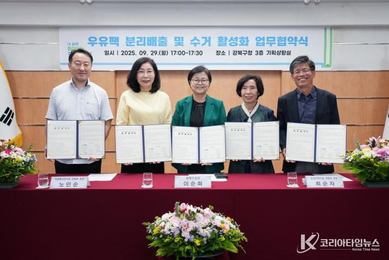 코리아타임뉴스 사회팀 | 서울 강북구는 9월 29일(월) 구청 기획상황실에서 강북구어린이집연합회와 어진이마을관리 사회적협동조합과 함께 우유팩 분리배출 및 수거 활성화 기반 구축을 위한 업무협약을 체결했다고 밝혔다.