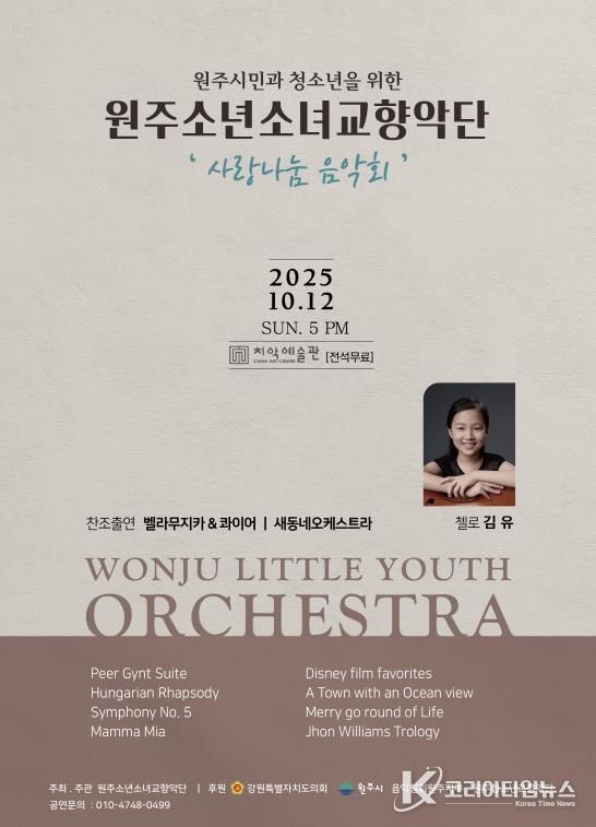 코리아타임뉴스 한장선 객원기자 | 원주소년소녀교향악단은 오는 12일 오후 5시, 치악예술관에서 ‘사랑나눔음악회’를 통해 지역사회와 함께하는 따뜻한 무대를 마련한다.