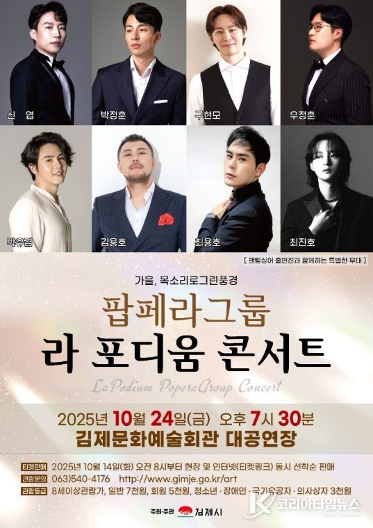 코리아타임뉴스 김태훈 기자 | 깊어 가는 가을, 특별한 음악의 향연 팝페라 그룹'라 포디움 콘서트'가 오는 24일 오후 7시 30분 김제문화예술회관 대공연장에서 펼쳐진다.