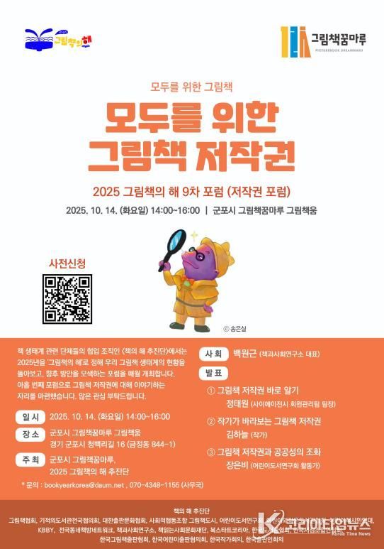 군포시 그림책꿈마루와 2025년 그림책의 해 추진단이 공동 주최하고 백원근 책과사회연구소 대표의 사회로 진행되는 이번 포럼은 ‘모두를 위한 그림책 저작권’이라는 주제로 전문가, 작가, 시민들이 함께 참여하여 그림책 저작권 침해사례와 저작권 보호 및 인식개선방안에 대하여 심도있는 논의를 할 예정이다.