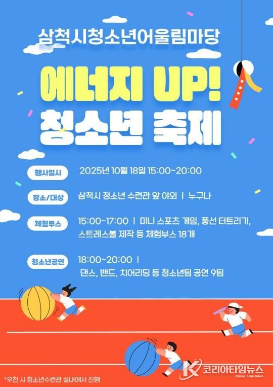 코리아타임뉴스 한장선 객원기자 | 삼척시청소년수련관은 오는 10월 18일 오후 3시부터 관내 청소년과 가족을 대상으로 2025 삼척시청소년어울림마당 『에너지 UP! 청소년축제』를 개최한다.