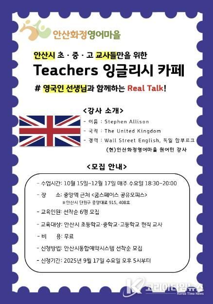 코리아타임뉴스 윤광희 기자 | 안산시 안산화정영어마을은 오는 15일부터 12월 17일까지 관내 소속 교사를 대상으로 ‘티처스(Teachers) 잉글리시 카페’를 운영한다고 10일 밝혔다.