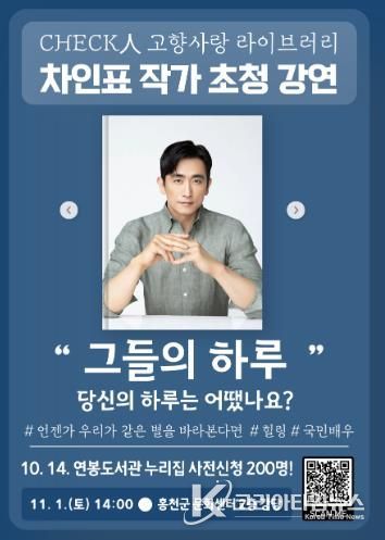 코리아타임뉴스 한장선 객원기자 | 홍천군립도서관은 11월 1일 오후 2시 홍천군 문화센터 2층 강당에서 차인표 작가를 초청하여 체크인 고향사랑 라이브러리 마지막 강연을 개최한다.