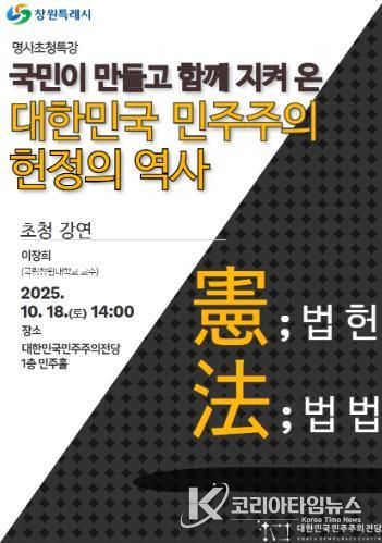 코리아타임뉴스 오영주 기자 | 창원특례시는 오는 10월 18일 오후 2시, 대한민국민주주의전당 민주홀에서 ‘대한민국 민주주의 헌정의 역사’ 특별 강연을 개최한다고 밝혔다.