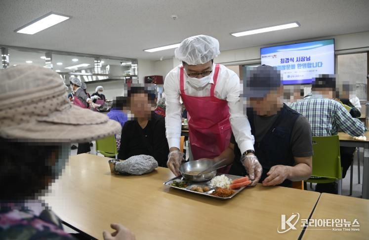 코리아타임뉴스 김태훈 기자 | 최경식 남원시장이 지난 10일 기능보강이 완료된 남원사회복지관 경로식당을 방문해 배식 봉사를 진행하며 어르신들과 소통하는 시간을 보냈다.
