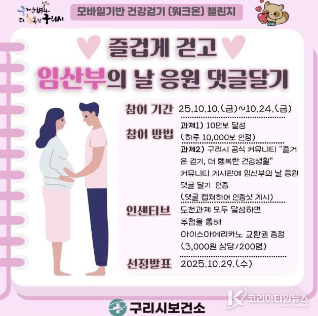 코리아타임뉴스 경기취재본부 | 구리시는 제20회‘임산부의 날’(10월 10일)을 기념해 임신과 출산의 가치를 되새기고 시민 건강 증진을 도모하기 위한 ‘즐겁게 걷고, 임산부의 날 응원 댓글 달기’ 챌린지를 오는 10월 10일부터 24일까지 15일간 운영한다고 밝혔다.
