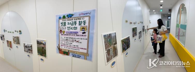 이번 전시는 ESG 자원순환 프로젝트의 일환으로 유아들이 재활용품을 활용해 직접 ‘빗물 저금통’을 제작하고 장마철 모은 빗물을 화분에 물 주기, 양말 빨기 등 생활 속에서 활용한 과정을 담았다.