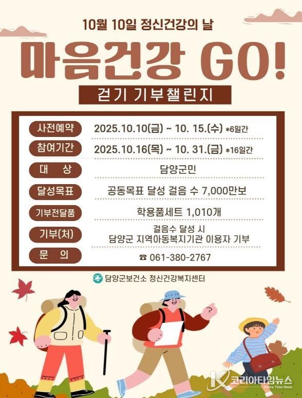 코리아타임뉴스 전남취재본부 | 담양군은 10월 10일 ‘세계 정신건강의 날’을 맞이하여 전 군민을 대상으로 걷기 기부 챌린지를 운영한다고 밝혔다.