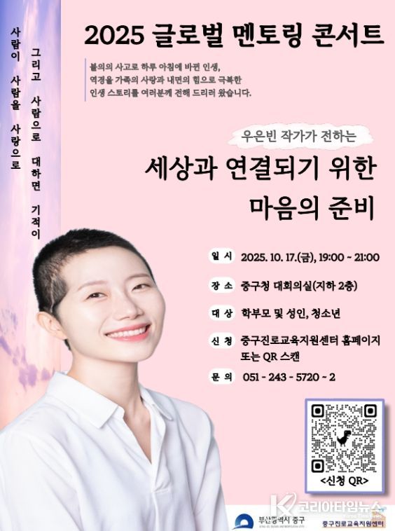 코리아타임뉴스 이아름 기자 | 부산 중구는 중구 진로교육지원센터 주관으로 오는 10월 17일 오후 7시, 중구청 지하2층 대회의실에서 '2025 글로벌 멘토링 콘서트'를 개최한다.