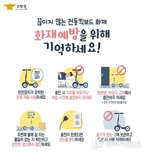 개인형 이동수단 충전 시 주요 안전수칙으로는, ▲제품에 맞는 정품 충전기 사용 ▲환기 잘 되는 장소에서 충전 ▲취침 중·외출 시 무인 충전 금지 ▲권장 충전 시간 준수 및 완충 시 즉시 전원 차단 ▲충전 중 이상 발열·냄새·연기 발생 시 즉시 중단 ▲충격·침수·손상된 배터리 사용 금지 ▲가연성 물질 근처 충전 금지 ▲공동주택 복도, 계단, 비상구 등 피난통로에서 충전 금지 ▲세대 내 충전 시 난연성 소재 위에서 충전 ▲소화기 등 초기대응 장비 비치를 권장한다.