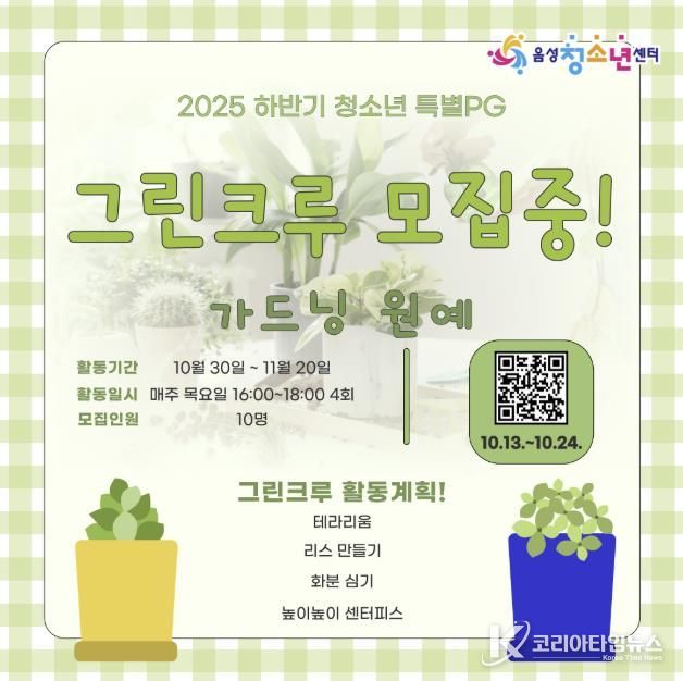 코리아타임뉴스 충북취재본부 | 음성청소년센터는 하반기 청소년 특별 프로그램인 ‘그린크루 모집 중!’을 운영한다고 13일 밝혔다.