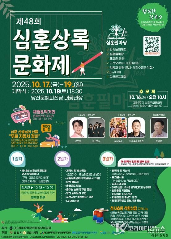 코리아타임뉴스 김택호 기자 | 당진시는 제48회 심훈상록문화제가 10월 17일부터 19일까지 사흘간 당진문예의전당 일원에서 열린다고 13일 밝혔다.