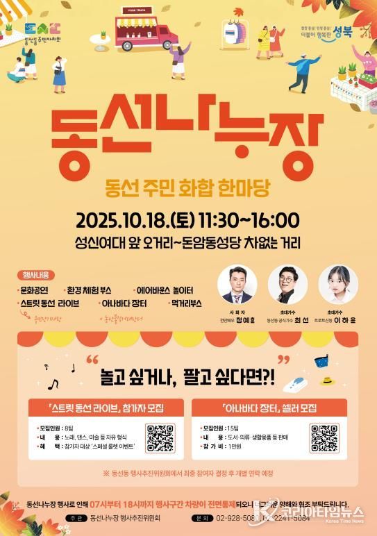 코리아타임뉴스 문화팀 | 서울 성북구가 오는 10월 18일 오전 11시 30분부터 오후 4시까지 성신여대 앞 오거리에서 돈암동성당 구간까지 이어지는 도로에서 ‘2025년 차 없는 거리 동선나누장’을 개최한다.