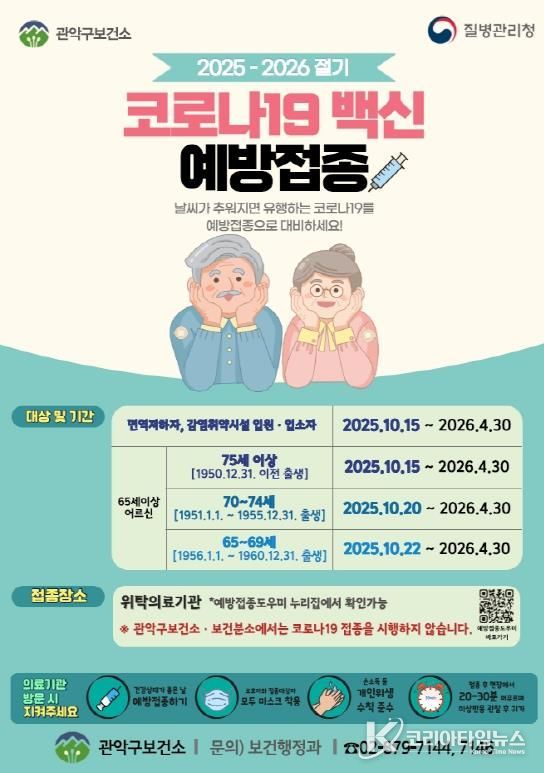 코리아타임뉴스 기동취재팀 | 관악구가 호흡기 질환이 증가하는 동절기 대비, 코로나19 감염 고위험군을 대상으로 코로나19 백신 무료 접종을 실시한다.