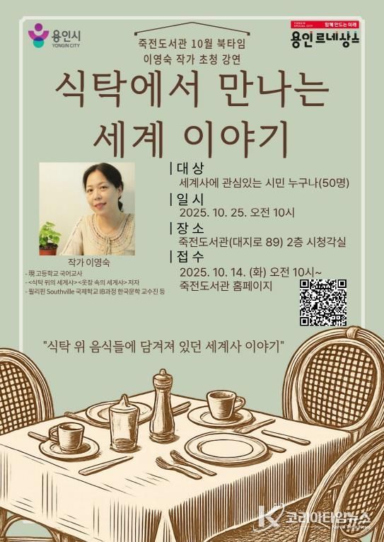 코리아타임뉴스 사회팀 | 용인특례시는 25일 오전 10시 죽전도서관 시청각실에서 죽전도서관 북타임 작가초청강연회 ‘식탁에서 만나는 세계 이야기’를 연다고 13일 밝혔다.