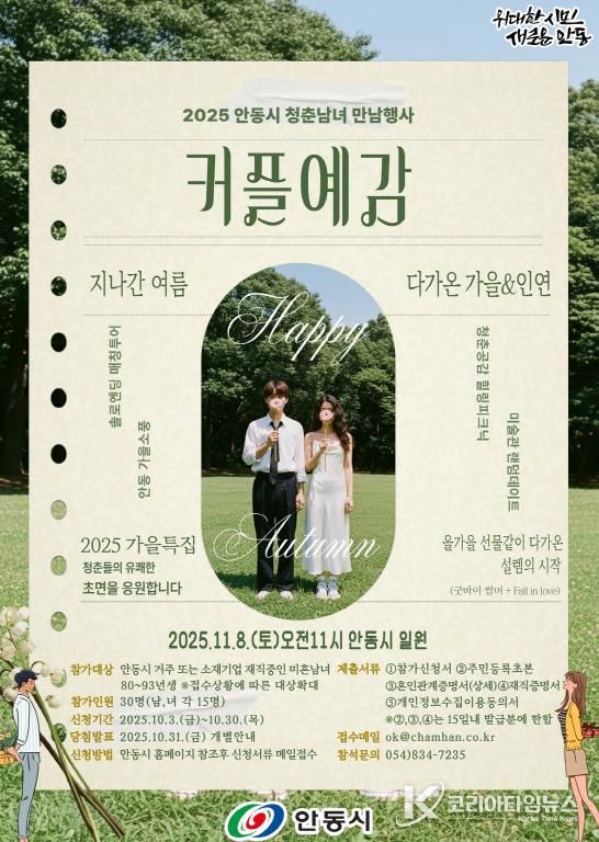 코리아타임뉴스 노승선 기자 | 안동시가 청춘남녀의 건강한 만남을 지원하기 위해 마련한 ‘2025 커플예감! 힐링피크닉’ 시즌4 참가 신청을 10월 30일까지 접수한다.
