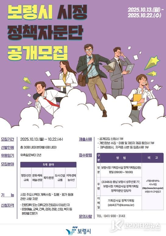 코리아타임뉴스 충남취재본부 | 보령시는 지역 시정 발전에 대해 조언·권고·건의 등의 자문을 얻고자 보령시 시정 정책자문단 신규 위원을 10월 13일부터 22일까지 10일간 공개 모집한다고 밝혔다.