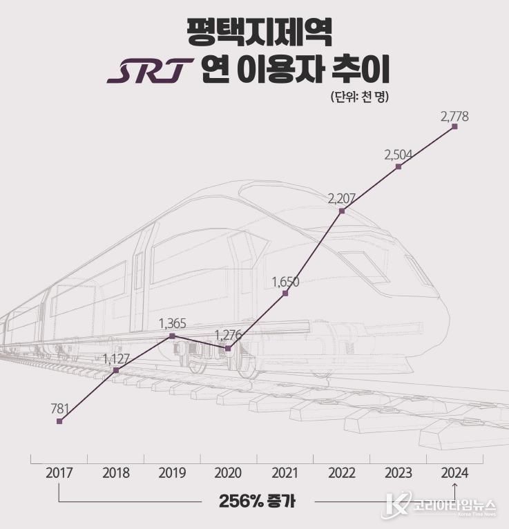 평택지제역은 2016년 개통 당시부터 SRT가 정차한 역사로, 매년 이용객 수가 꾸준히 증가하고 있다. 실제 ‘철도연감’에 따르면 평택지제역의 연간 SRT 승하차 인원은 2017년 78만 1천 명이었지만, 2024년에는 277만 8천 명으로 256%의 증가율을 기록했다. 이러한 증가율은 SRT 역사 중 가장 높은 수치다.