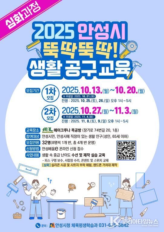 코리아타임뉴스 경기취재본부 | 안성시는 시민들의 생활 자립 역량 강화를 위해 '뚝딱뚝딱 생활 공구[심화과정] 교육'을 오는 10월 25~26일과 11월 8~9일, 총 2회 주말 일정으로 운영한다고 밝혔다.