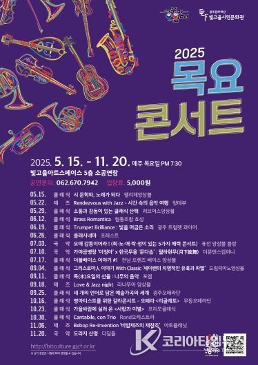 코리아타임뉴스 노승선 기자 | 광주문화재단(대표이사 노희용)은 오는 10월 16일, 23일, 30일 목요일 저녁 7시 30분, 빛고을아트스페이스 5층 소공연장에서 ‘10월의 목요콘서트’를 개최한다고 밝혔다.
