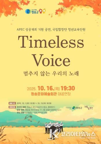 코리아타임뉴스 경북취재본부 | 청송군은 오는 16일 저녁 7시 30분, 청송문화예술회관 대공연장에서 APEC 성공개최를 기원하는 국립합창단 청년교육단원 공연 ‘Timeless Voice – 멈추지 않는 우리의 노래’를 개최한다.