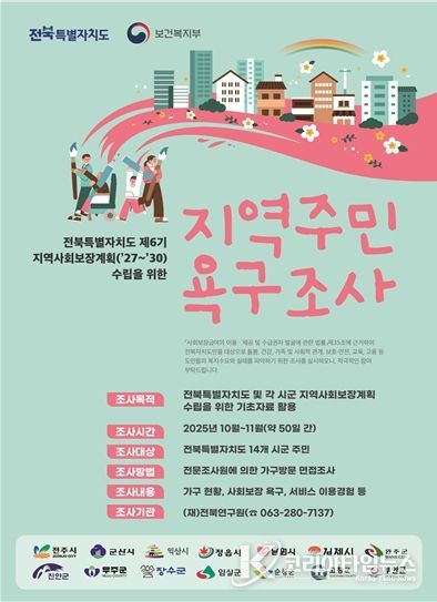 코리아타임뉴스 윤경수 기자 | 전북특별자치도가 지역사회 복지 욕구를 체계적으로 파악하고 주민이 체감하는 복지정책을 수립하기 위해 전 도민을 대상으로 지역주민 욕구조사를 실시한다.