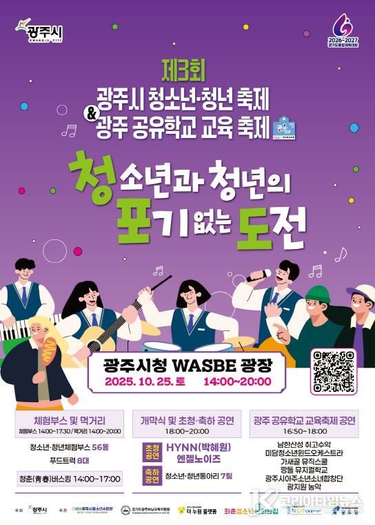 코리아타임뉴스 이아름 기자 | 광주시는 오는 25일 오후 2시부터 8시까지 시청 WASBE 광장에서 ‘제3회 광주시 청소년·청년 축제 청·포·도 · 광주 공유학교 교육 축제’를 개최한다고 14일 밝혔다.